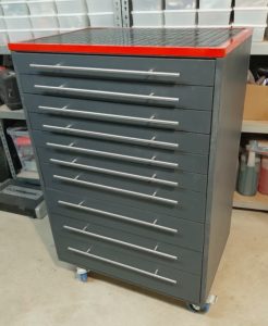 La solution ultime, les mécaniciens l’ont bien compris, une servante ! C’est un meuble composé exclusivement de tiroir, de profondeurs particulièrement faible. L’avantage d’avoir plein de tiroirs peu profond plutôt qu’un grand tiroir c’est que l’on y retrouve bien plus facilement ses outils. Imaginez toutes ces choses de votre atelier, triées et rangée dans des tiroirs, à l’abri de la poussière, le tout dans un meuble compact et sur roulette.
