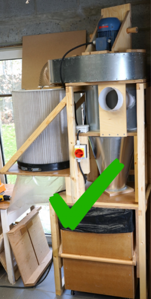 On peut mettre un filtre si on veut, mais on peut aussi souffler l’air vers l’extérieur pour ne plus avoir de consommable. Le cyclone trie 99,99% des poussières et copeaux.