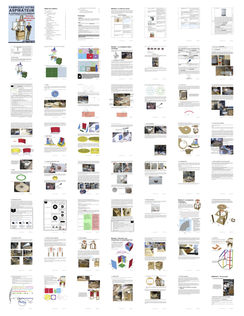 Fabriquer une machine ça n’est pas anodin. Vous avez probablement certaine inquiétude pour certaine étape. L’équilibrage de l’hélice par exemple, cette étape vous inquiète peut-être ? J’ai donc réalisé un guide de plus de 55 pages pour répondre à toutes ces questions. Vous pouvez entrevoir sur cet aperçu. Je n’ai aucun doute sur le fait que tout le monde peut fabriquer cet aspirateur. Vous y trouverez les plans de chacunes des pièces, photos, conseils étape par étape. Il y a également des plans à imprimer à l’échelle 1 pour faciliter la fabrication.