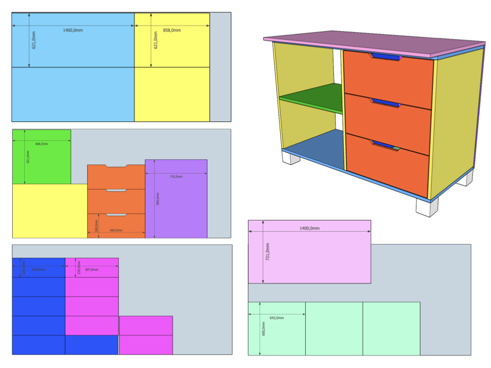 Si vous pensez qu'utiliser un plan 3D demande trop de compétences et de temps, vous vous trompez ! Grace à un logiciel 3D, on peut visualiser la réalisation, et être sûr de ne pas se tromper lors de la fabrication du meuble. Si l'on réalise une fiche de débit sur ordinateur, on peut être sûr à 100% de ne pas faire d'erreurs, ce qui peut faire économiser beaucoup de temps et d'argent !