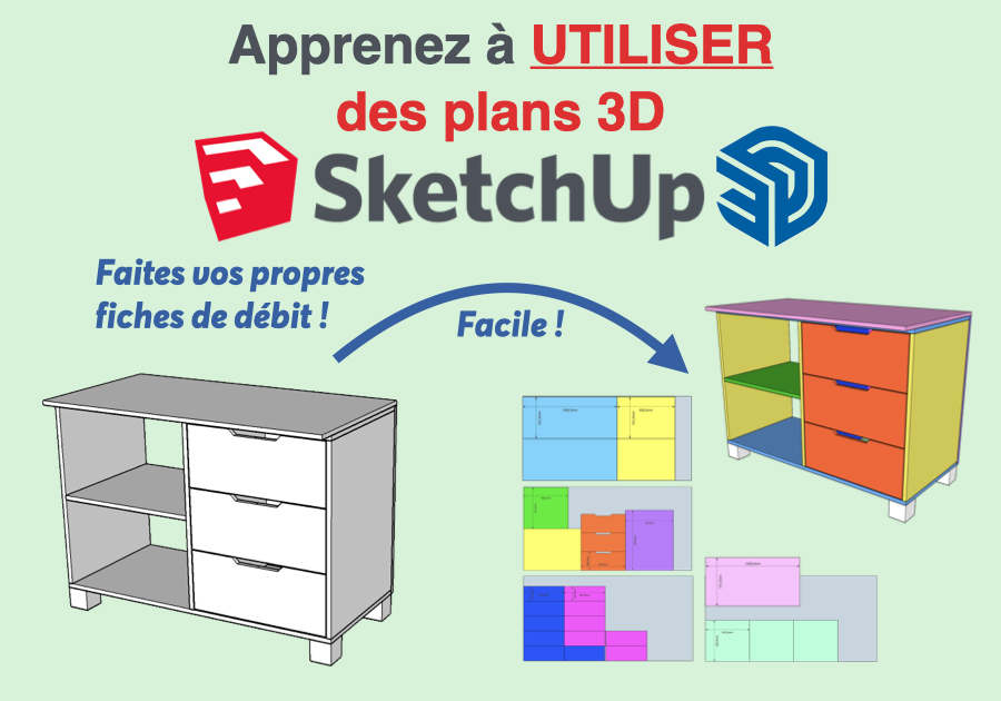 Cette formation vous est adéquate si vous avez envie de faire vos premiers pas dans le monde du 3D. Je ne parlerai d’aucune extension SketchUp qu’il existe pour réaliser des fiches de débit (tel que OpenCutList créé par Boris Beaulant et Martin Müller). Selon moi, si vous vous intéressez à ces plugins c’est que vous maitrisez déjà d’avantage l’application. De plus, il existe de nombreux tutoriels et explications concernant ces plugins.
